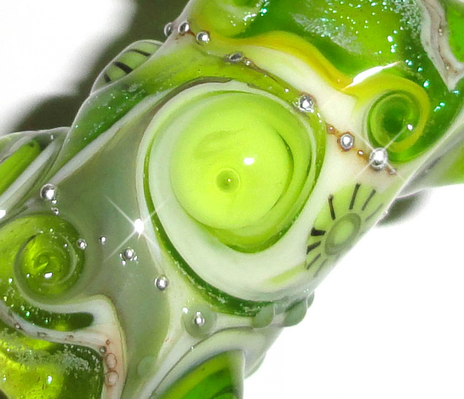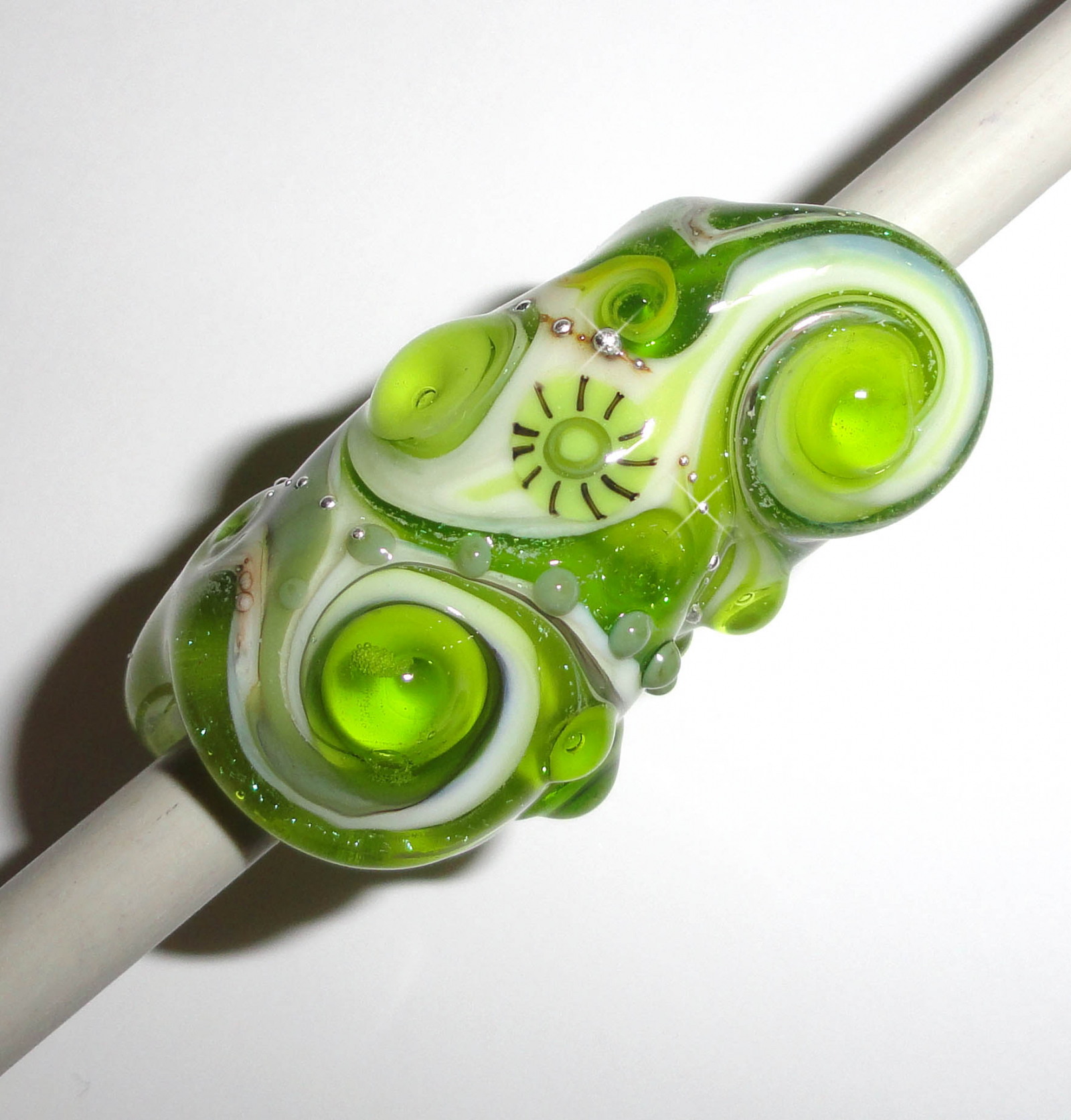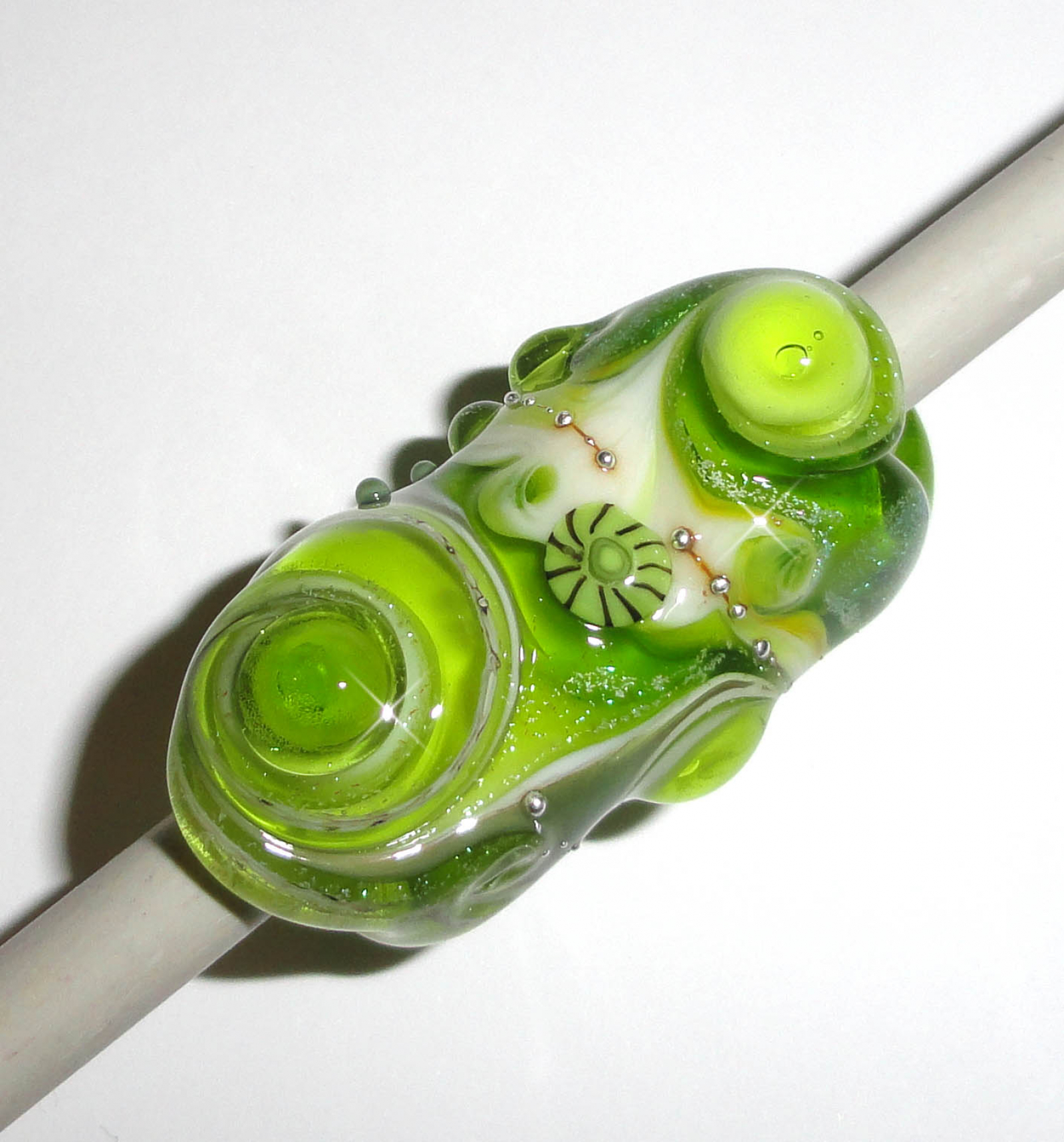 COLORS: Deep Grass Green, Light Grass, Emerald, Ivory, Olive, Mottled Earth, pure silver trailing, 2 of my handmade murrini and lots of dichroic shimmer!