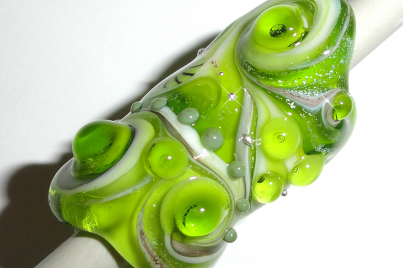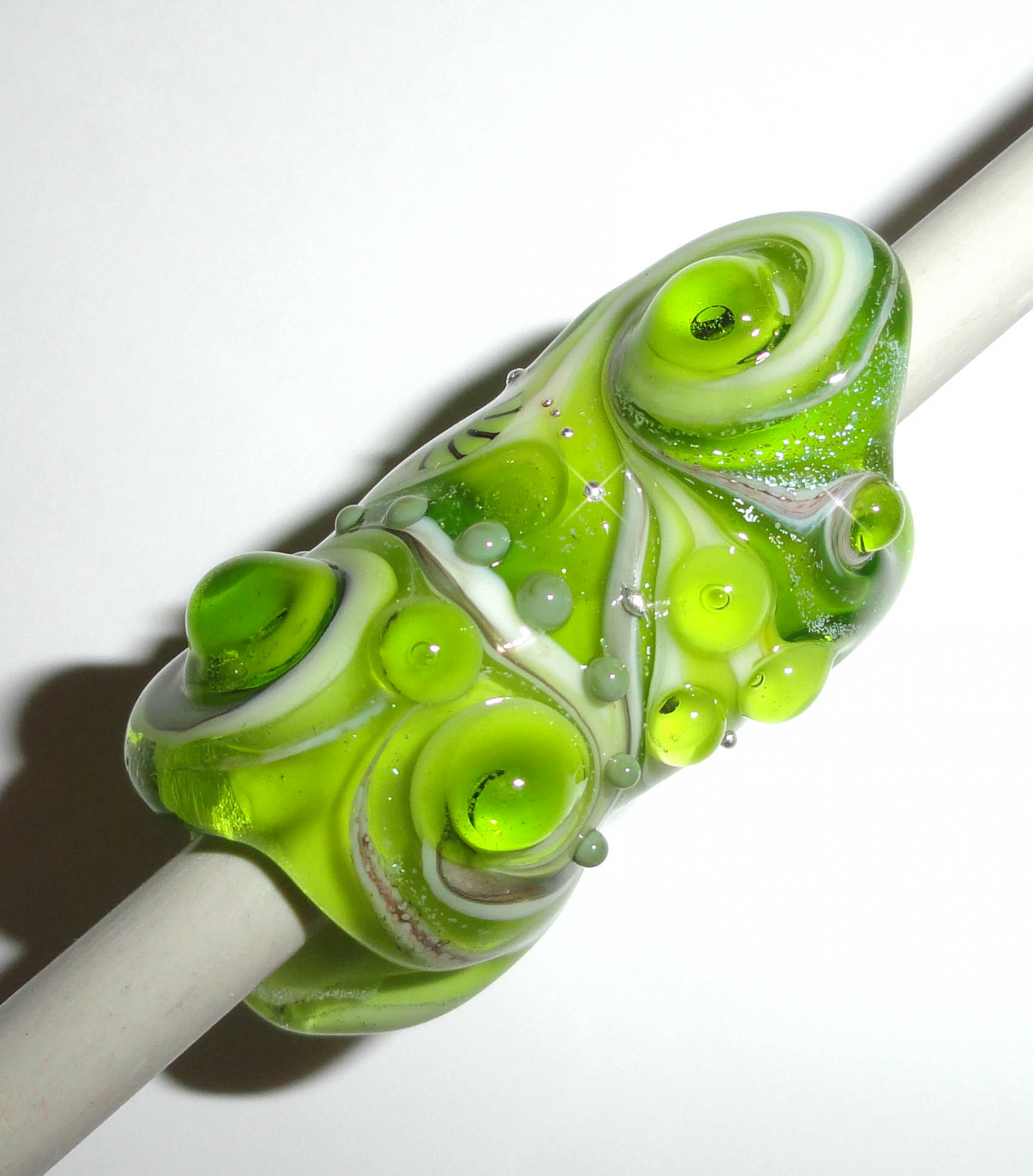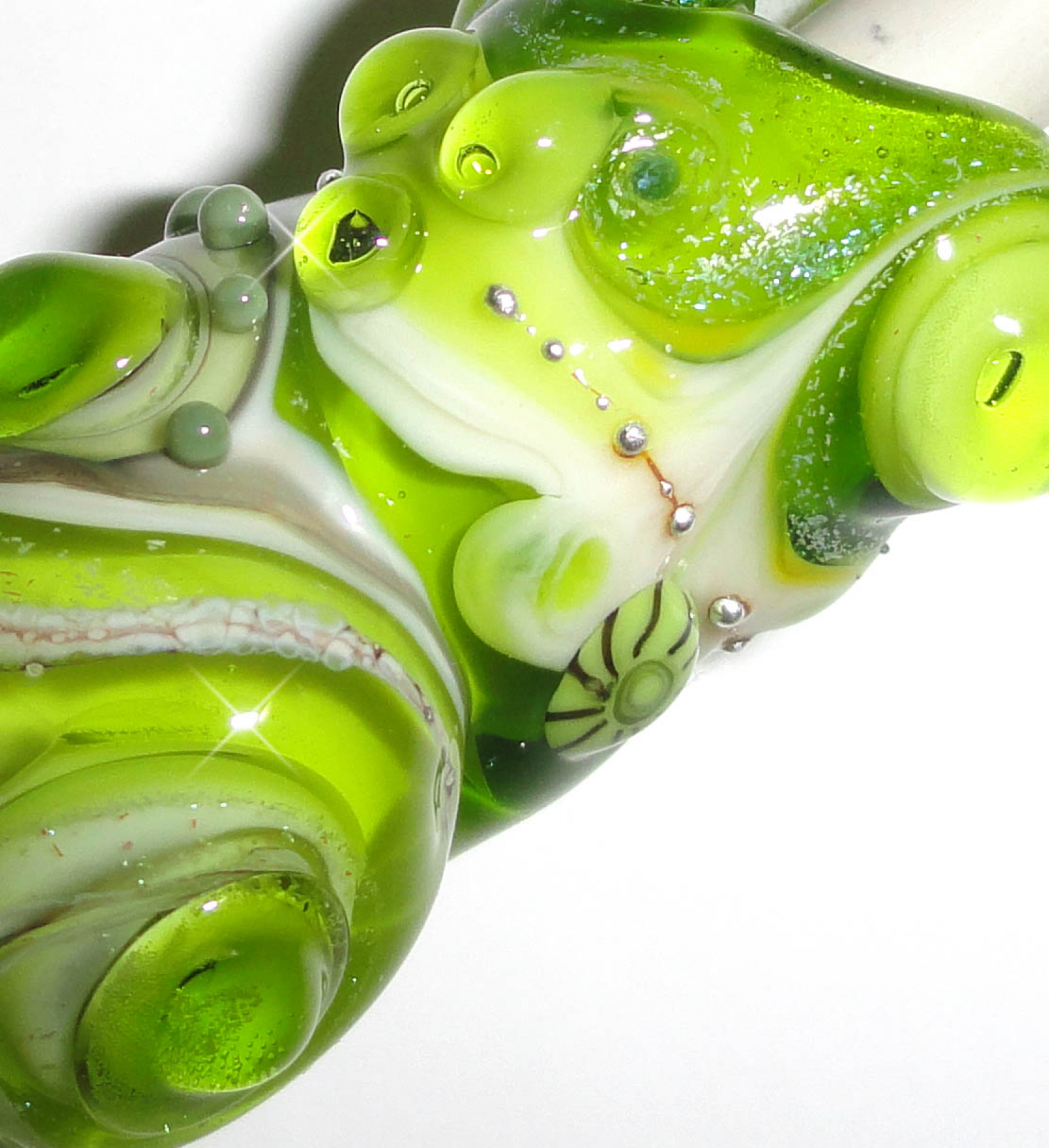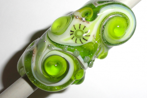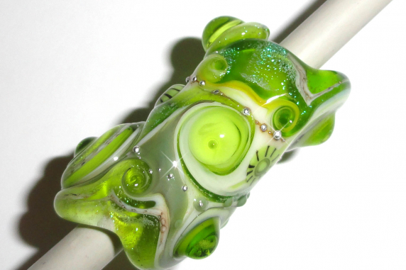 COLORS: Deep Grass Green, Light Grass, Emerald, Ivory, Olive, Mottled Earth, pure silver trailing, 2 of my handmade murrini and lots of dichroic shimmer!