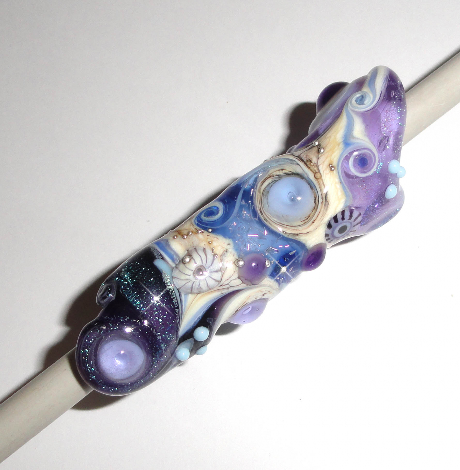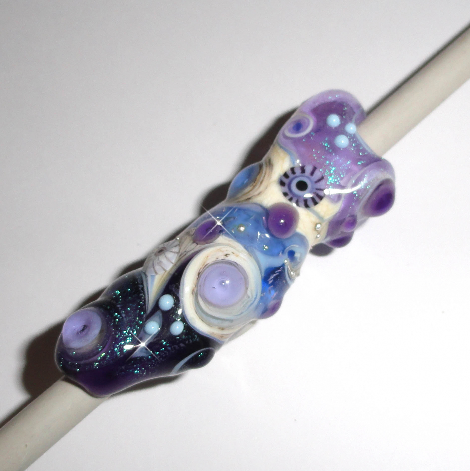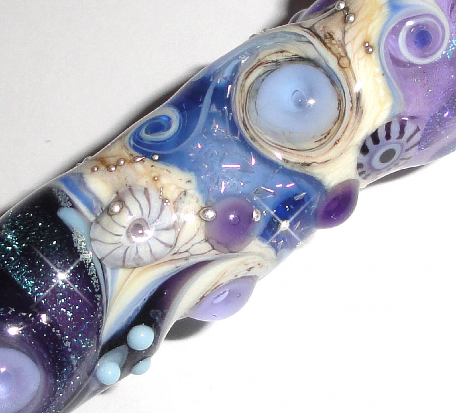 COLORS: Deep Violet, Lavender, Ivory, Ocean Blue, Sky, Mottled Earth, pure silver trailing, 2 of my handmade murrini and LOADS of dichroic shimmer!