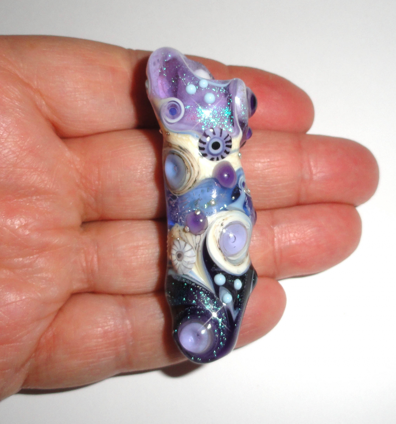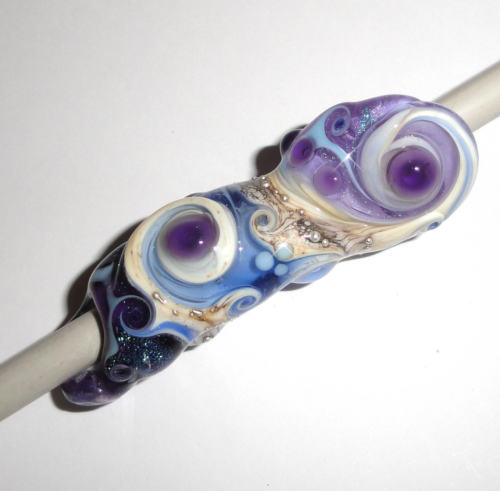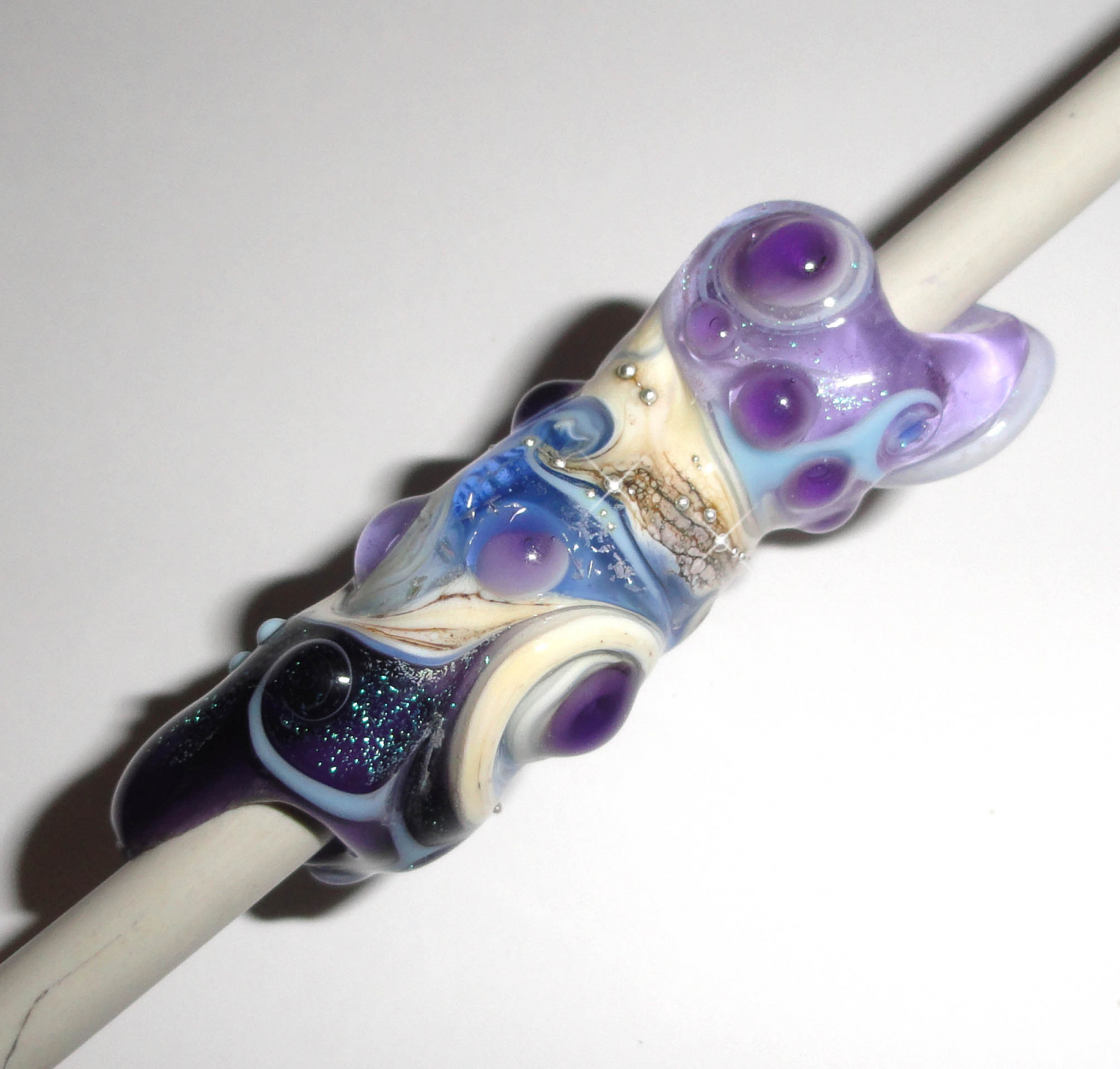 COLORS: Deep Violet, Lavender, Ivory, Ocean Blue, Sky, Mottled Earth, pure silver trailing, 2 of my handmade murrini and LOADS of dichroic shimmer!