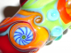 To use: No special treatment for these babies. Simply heat a spot on your bead, waft the murrini slice in the flame to warm it up a but and stick it in the spot you want it in. Alternate warming and flattening (not too fast!) until you get the look you want and that's that! Leave it as-is or top it with a clear blob for a lens effect. Try twisting the edges w/ a clear stringer, heat and drag through the center for a feathered look, the possibilities are endless!....Play!! Experiment! CREATE